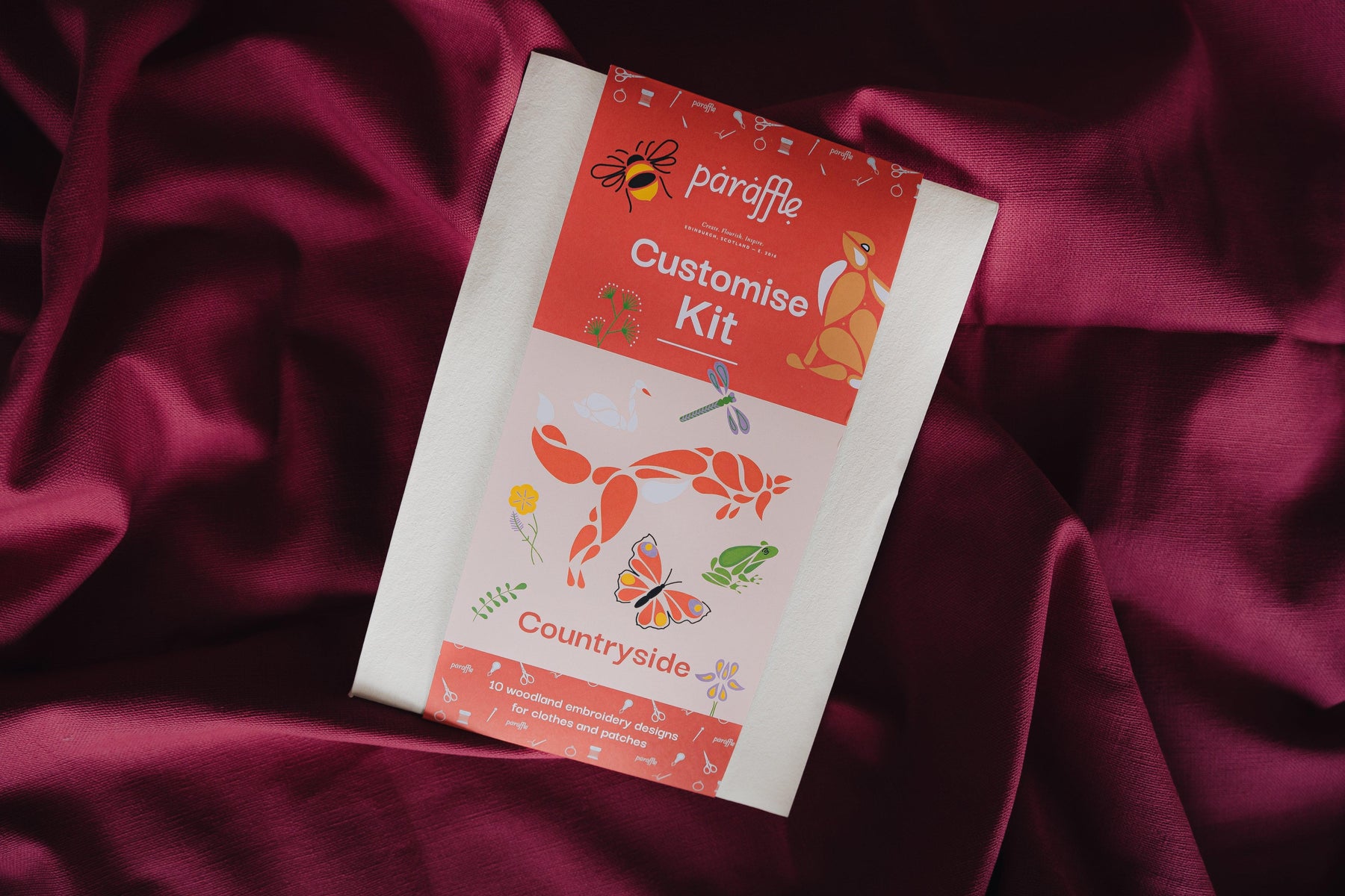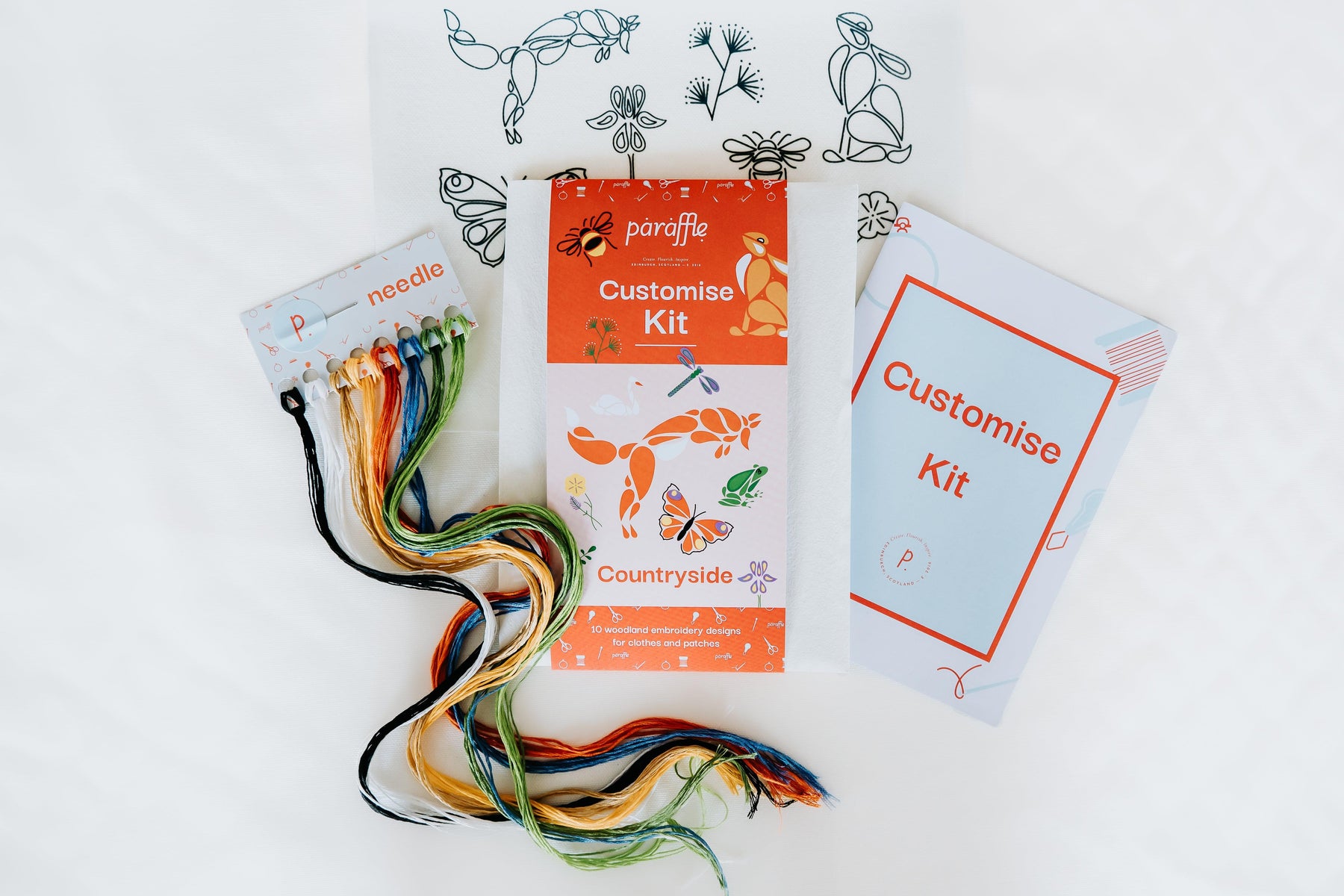 Including mini versions of popular Paraffle designs such as the Fox, Hare, Butterfly, Swan, Frog, and Dragonfly - plus a tiny Bee and three Floral designs - this kit will encourage you to refresh old clothes and move away from fast fashion. The woodland themed kit includes 8 gorgeous shades of DMC thread - and encourages you to use your own creativity to make your own individual pieces. The transfer is self adhesive and dissolves in water, so all you need to do is cut out the transfer, stick it on your clothes; stitch; then rinse it away! Even better, the envelope containing your kit is made from 100% recycled rags and is reusable. Brilliant! Paraffle note: After running out of my own clothes to stitch on,  I used the Bee and Frog to customize some of Ali’s plain T-shirts - and he loves them! I’m so keen to see what you decide to do with them!