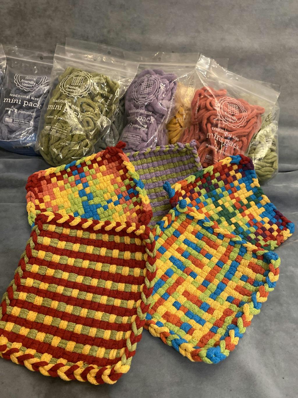 These cotton potholder loops are custom made to fit Friendly Loom™ Potholder Loom (Traditional Size). Each bag makes two 6" x 6" potholders.