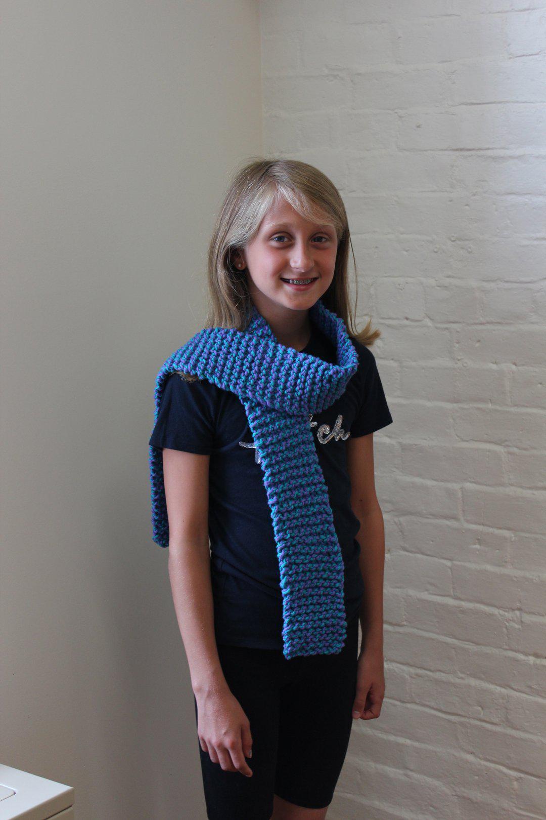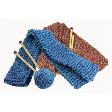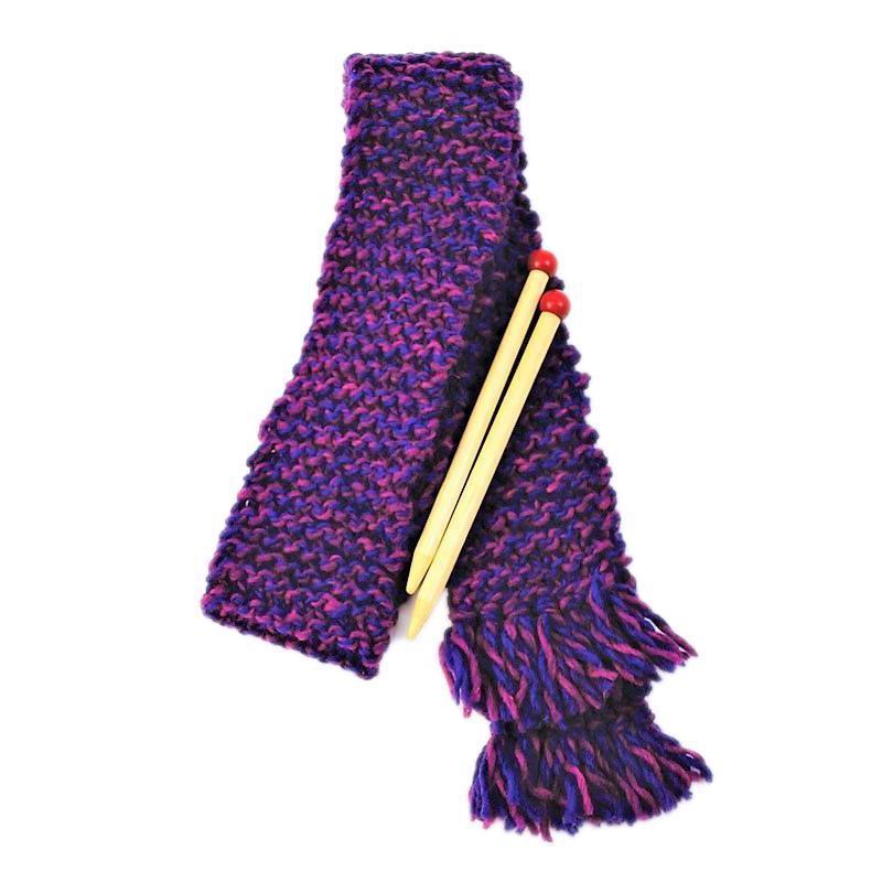 Learn to knit the simple garter stitch and make a scarf (approximately 3" x 50") with 100% wool 2-ply yarn in the following color options: