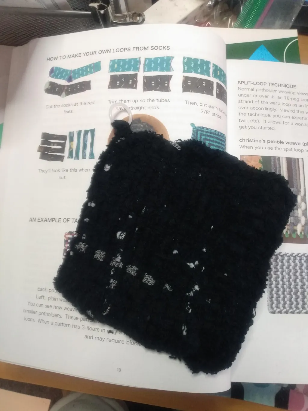 Very interesting book with lots of "out of the box" ideas for different kinds of patterns. Really gave me something to think about. Tried weaving a potholder from an old pair of black socks with their instructions. It was a little rough, so will look for different kind of sock, but adding the little plastic loop is a nice touch!