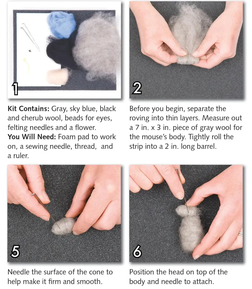 -natural gray, sky blue, cherub, and black wool roving -2 felting needles -beads -small flower -detailed photo instructions