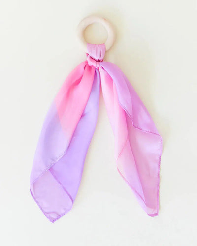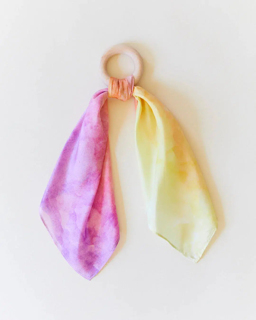 These simple teething toys are made of an American maple wood ring with a 21" Playsilk securely knotted onto it.